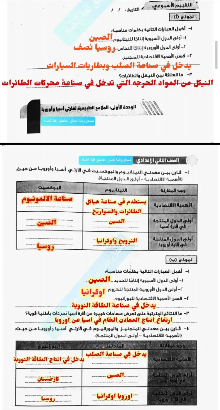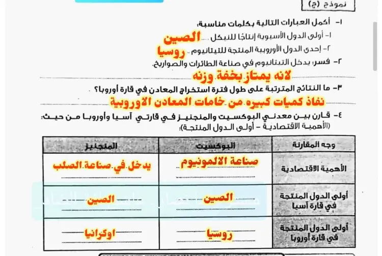 4- قارن بين معدني البوكسيت والمنجنيز في قارتي آسيا وأوروبا من حيث: (الأهمية الاقتصادية - أولى الدول المنتجة)