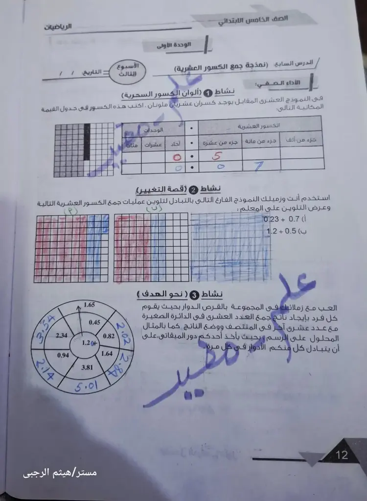 السؤال: استخدم أنت وزميلك النموذج الفارغ التالي بالتبادل لتلوين عمليات جمع الكسور العشرية التالية: أ) 0.7 + 0.23 (صورة 12)