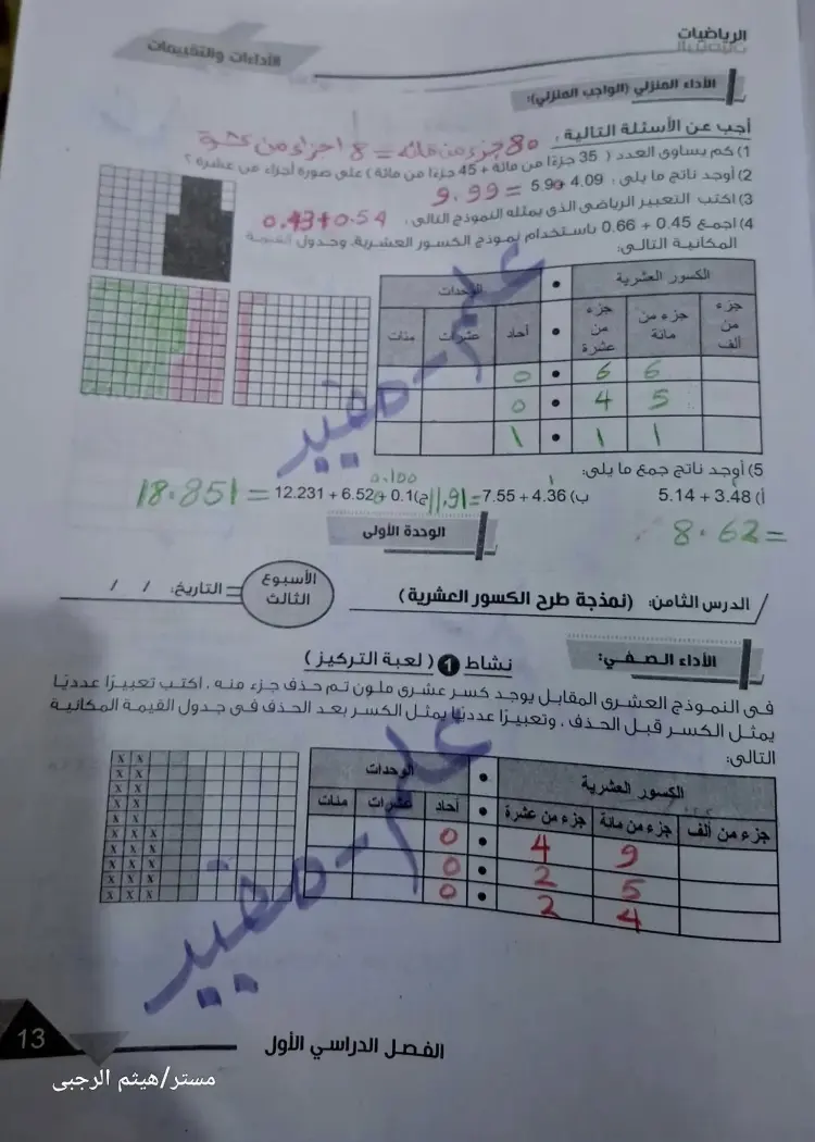 السؤال: في النموذج العشري المقابل يوجد كسر عشري ملون ثم حذف جزء منه، اكتب تعبيراً عددياً يمثل الكسر قبل الحذف، وتعبيراً عددياً يمثل الكسر بعد الحذف في جدول القيمة المكانية التالي. (صورة 13)