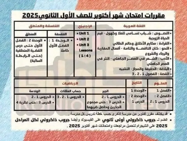 مقررات امتحان شهر أكتوبر للصف الأول الثانوي 2026 جميع المواد