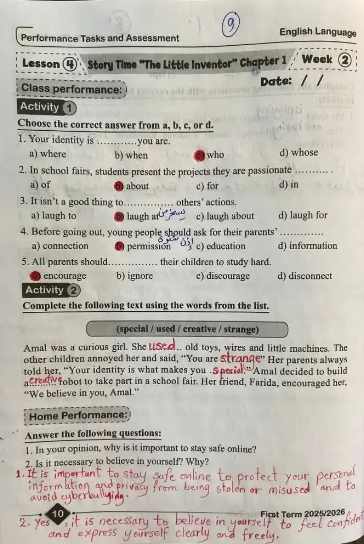 يجيب المدرسون عن الأسئلة الموجودة في ملف الأداءات والتقييمات الأسبوعية، ووفروا حل الأداء الصفي والواجب وتقييم الأسبوع الثاني إنجليزي للصف الثاني الابتدائي ترم أول 2026، وذلك تسهيلًا على الطلاب معرفة الإجابات الصحيحة للأسئلة.