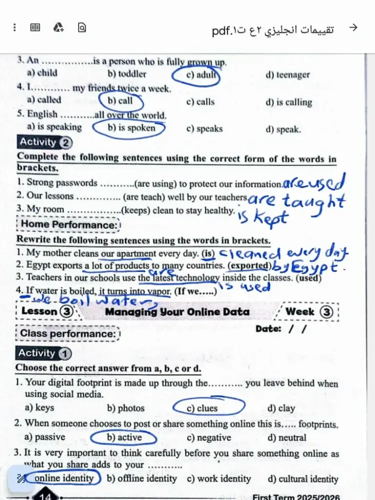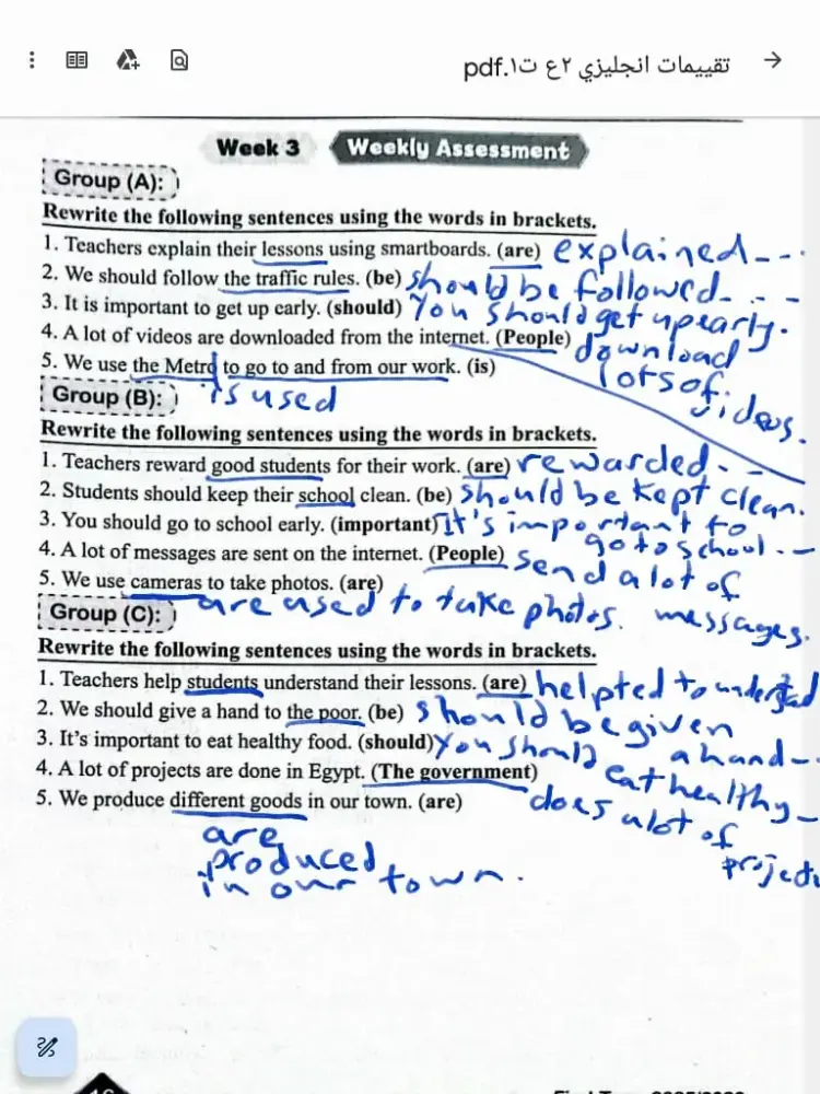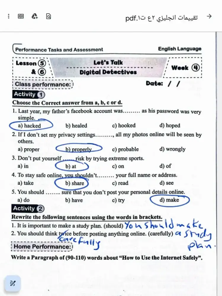 ويتطلع عدد كبير من الطلاب والطالبات للإطلاع على تلك الأداءات الصفية والمنزلية والتقييمات الأسبوعية مرفق بها الحل، لمعرفة الإجابات النموذجية لتلك الأسئلة.