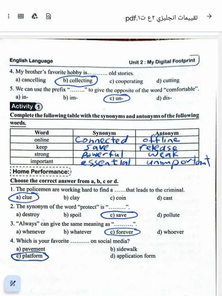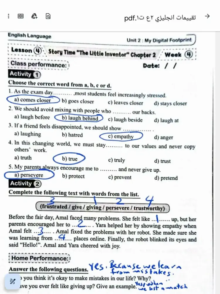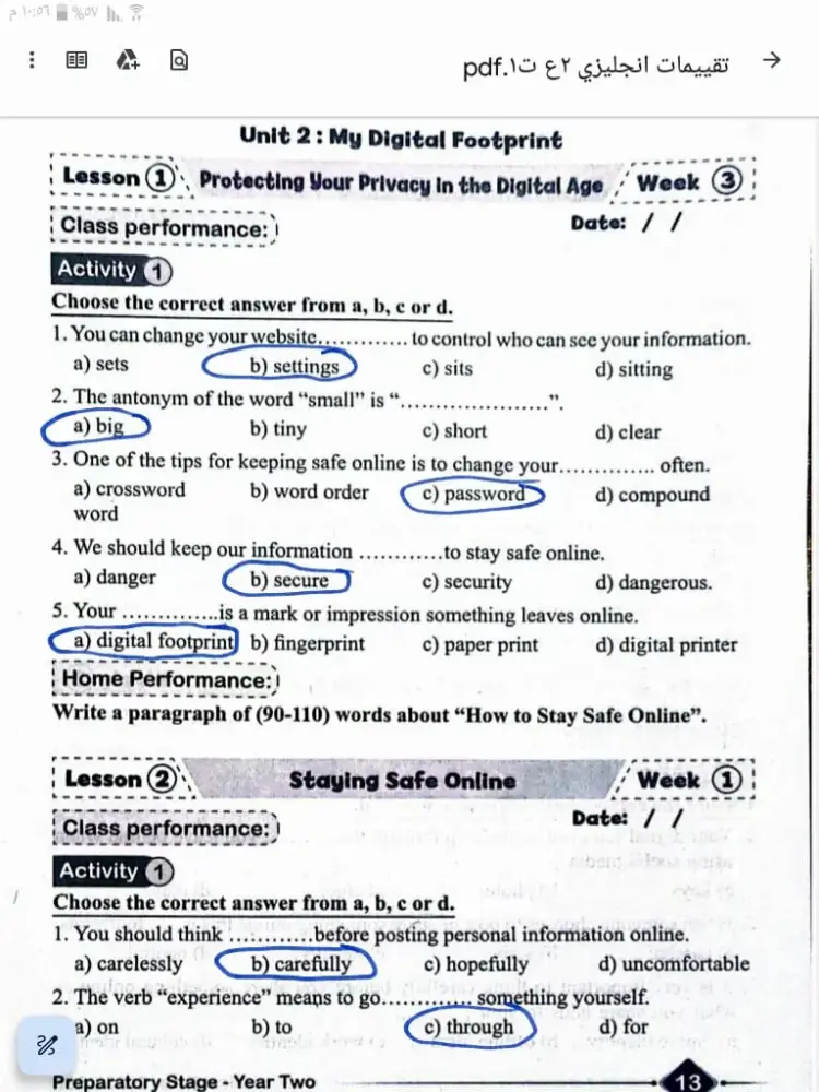 إجابات الأداء الصفي والواجب المنزلي والتقييم الأسبوعي انجليزي تانية إعدادي الوحدة الثانية