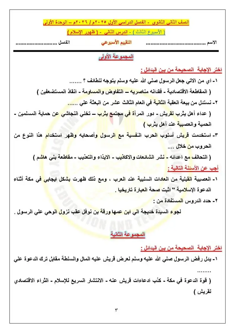 حل الأداء الصفي وواجب وتقييم الأسبوع الثالث تاريخ للصف الثاني الثانوي ترم أول 2026