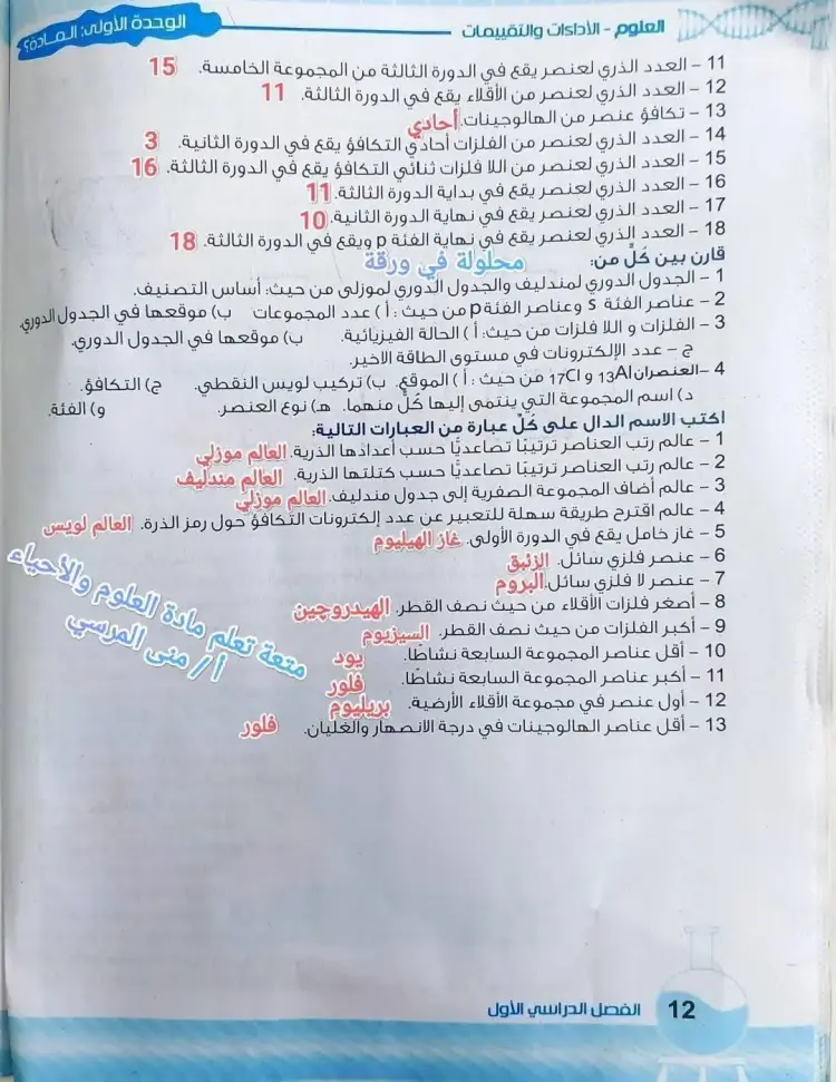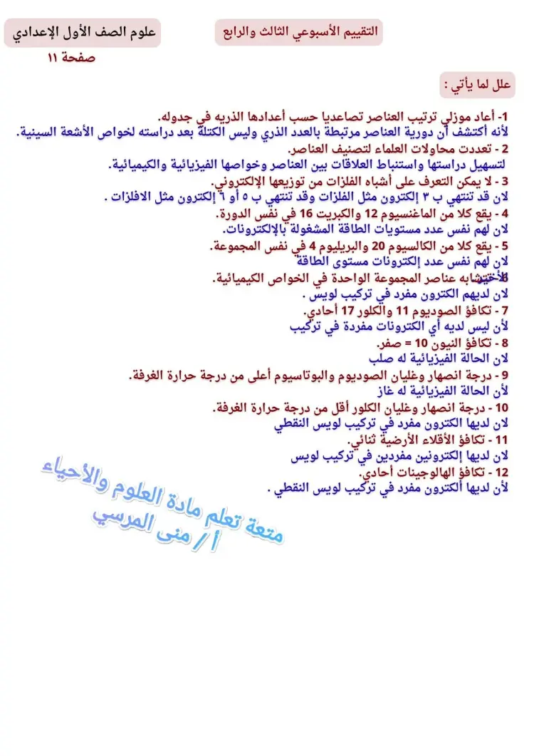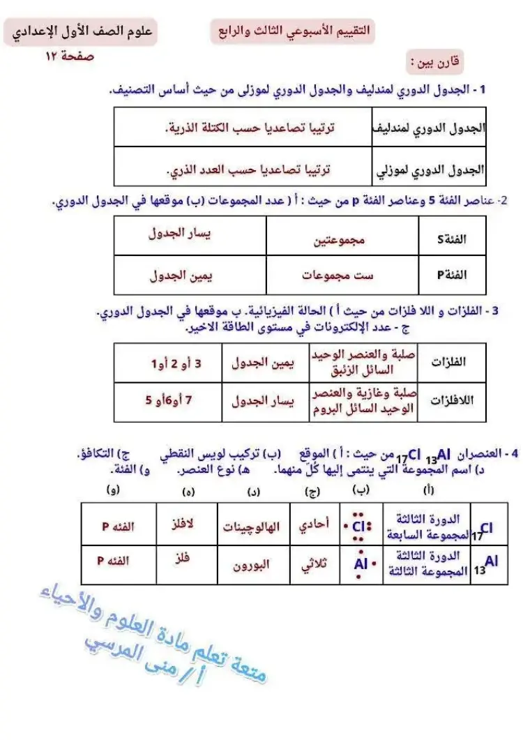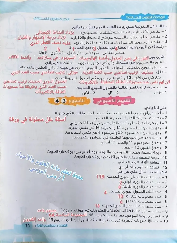 بدأ المعلمون في نشر نماذج حل أداءات وتقييمات مادة العلوم للصف الأول الإعدادي، والتي تغطي الدرس الثاني بعنوان «الجدول الدوري لتصنيف العناصر» ضمن الوحدة الأولى «المادة» بالأسبوعين الثالث والرابع، والتي تهدف إلى ترسيخ فهم الطلاب للمفاهيم الأساسية المتعلقة بحالات المادة وخصائصها.