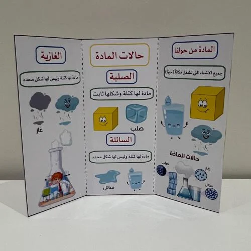 كشفت هذه مطوية حالات المادة عن خصائص كل حالة من حالات المادة الثلاث الرئيسية: الصلبة، والسائلة، والغازية.