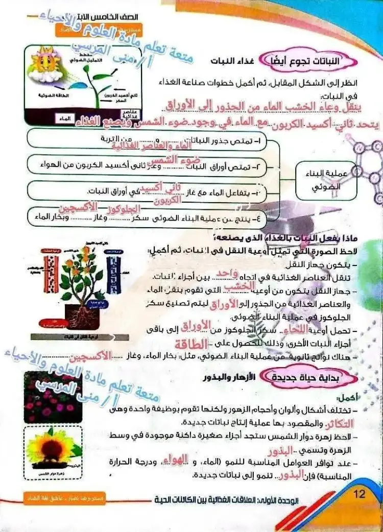 5. ما اسم الأجزاء المشغولة باللون الموجودة وسط زهرة دوار الشمس، وما أهميتها للنبات؟