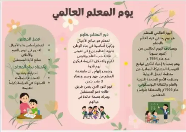 تناولت مطوية عن يوم المعلم فضل المعلم على طلابه، مشيرة إلى أن هذا الفضل لا يقتصر على مجرد التعليم الأكاديمي، بل يمتد ليشمل الجوانب الأخلاقية والسلوكية.