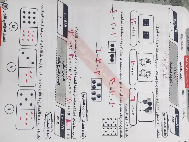 1. السؤال: (صورة قطعتي دومينو، واحدة بها 6 نقاط والأخرى 6 نقاط) 12 = 6 + 6