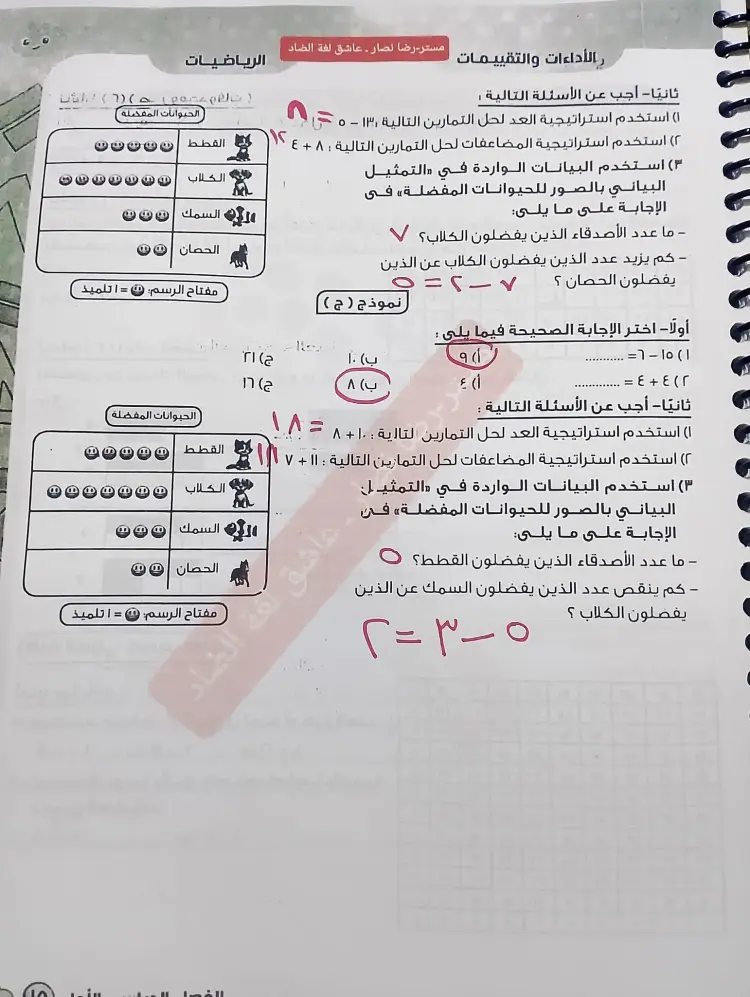 3. السؤال: كم يزيد عدد الذين يفضلون القطط عن الذين يفضلون الحصان؟ الإجابة: 2 = 5 - 7