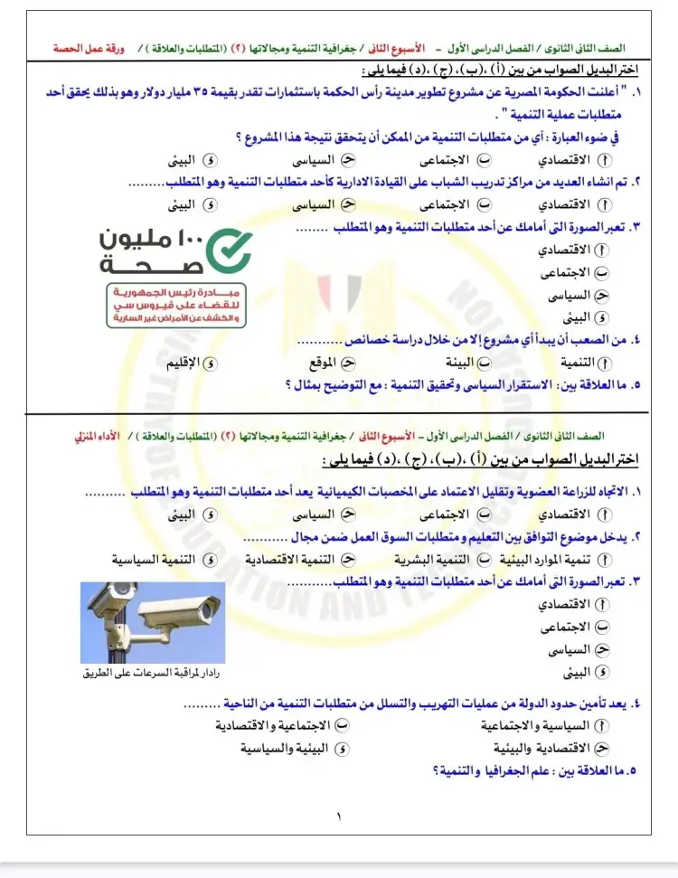 الأداء الصفي والواجب المنزلي والتقييم الأسبوعي الثاني جغرافيا للصف الثاني الثانوي الترم الأول 2026