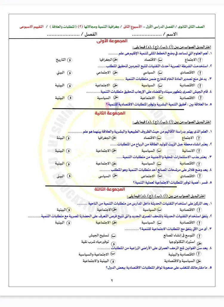 أداءات وتقييمات جغرافيا تانية ثانوي أسبوع ثاني ترم أول 2026