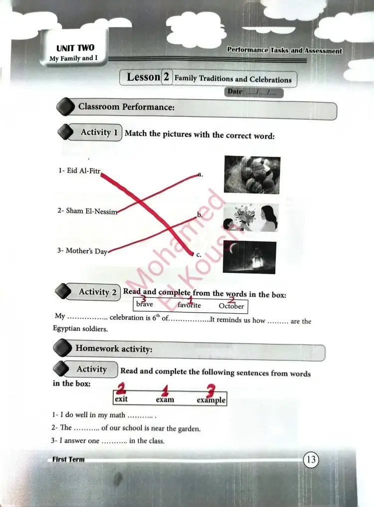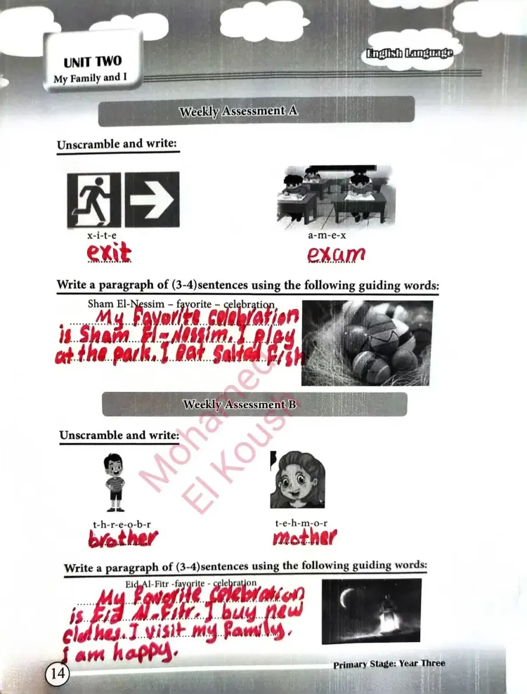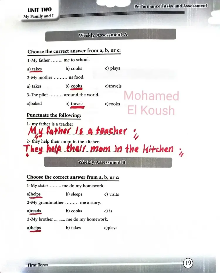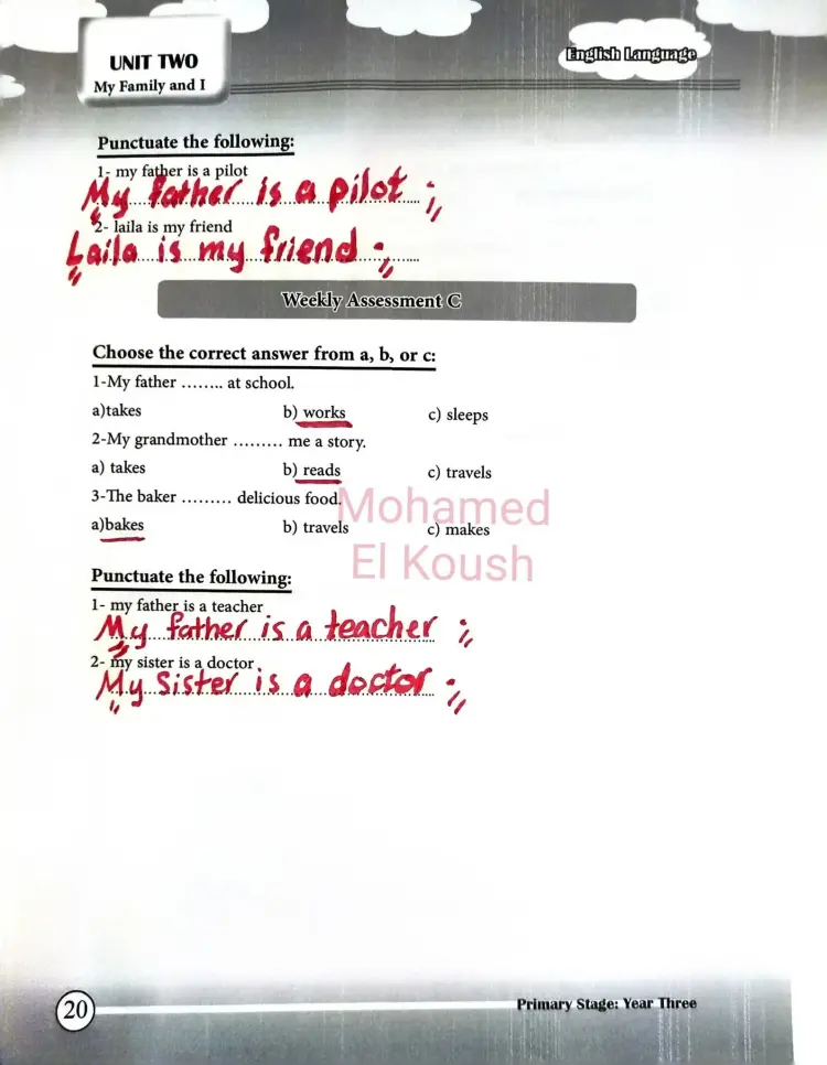 إجابات الأداء الصفي والواجب المنزلي والتقييم الأسبوعي للوحدة الثانية انجليزي تالتة ابتدائي