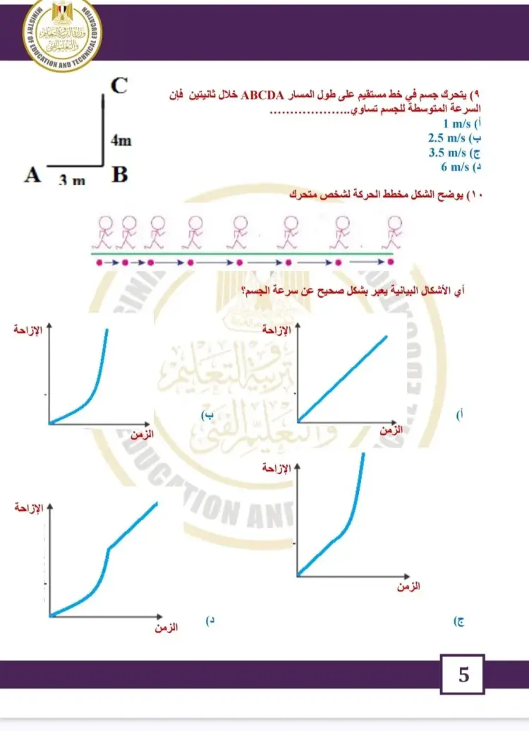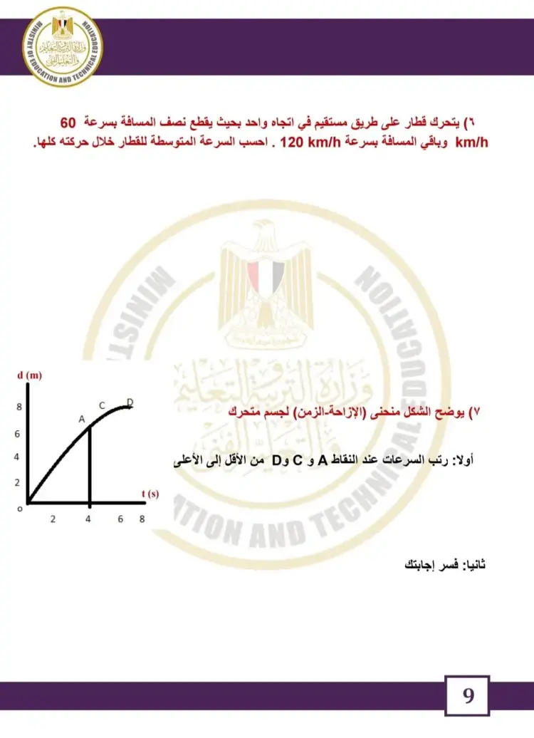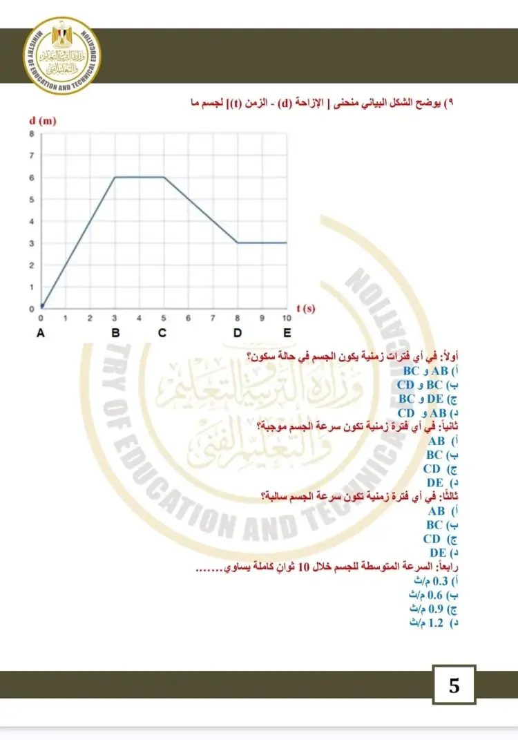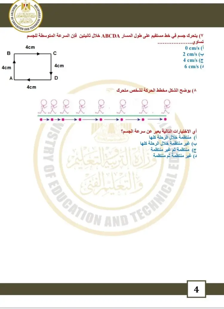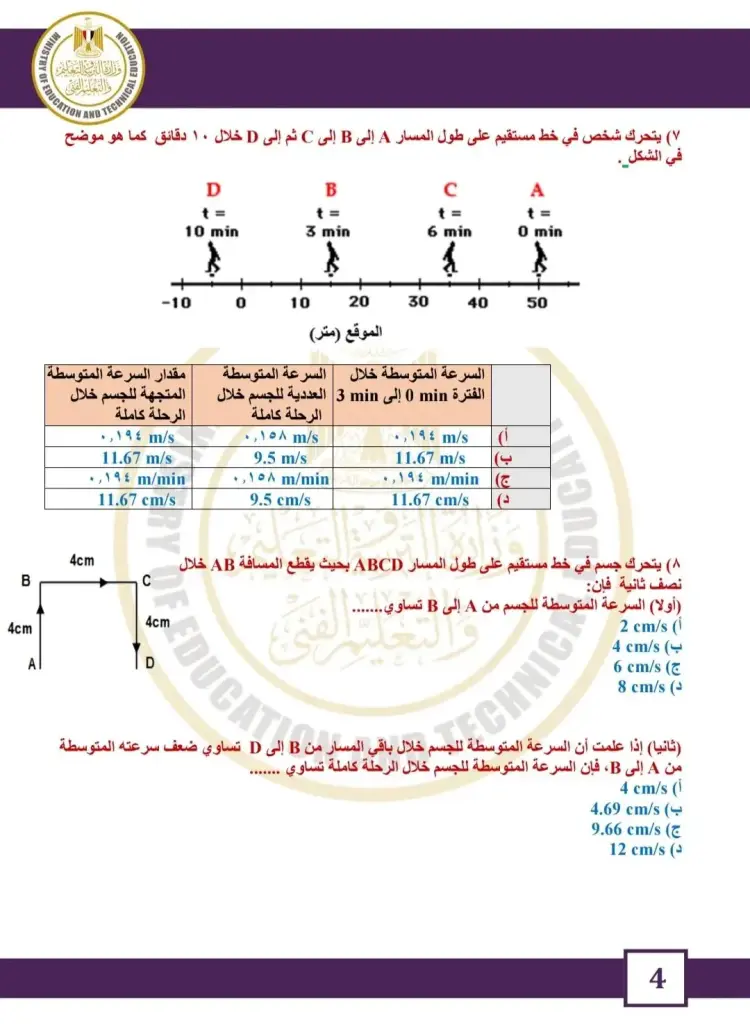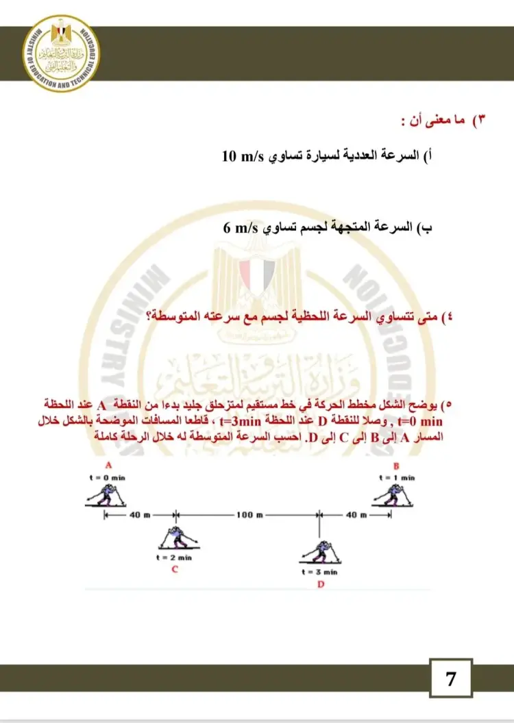 (ثانيًا) إذا علمت أن السرعة المتوسطة للجسم خلال باقي المسار من B إلى D تساوي ضعف سرعته المتوسطة من A إلى B، فإن السرعة المتوسطة للجسم خلال الرحلة كاملة تساوي: .......