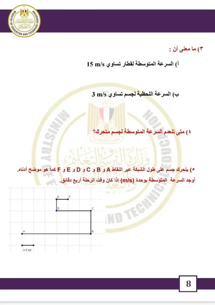7) يتحرك جسم على طول الشبكة عبر النقاط A و B و C و D و E و F كما هو موضح أدناه. أوجد السرعة المتوسطة بوحدة (m/s) إذا كان وقت الرحلة أربع دقائق.