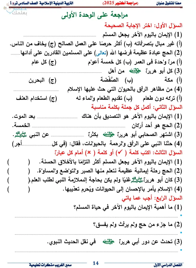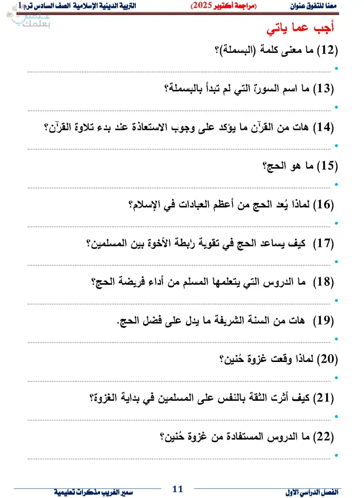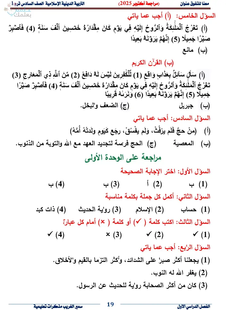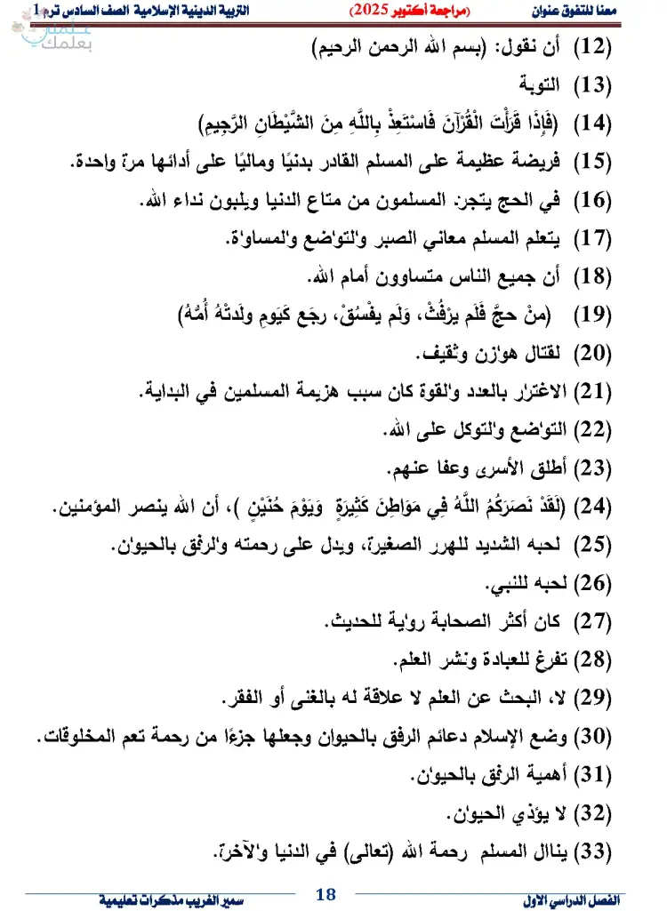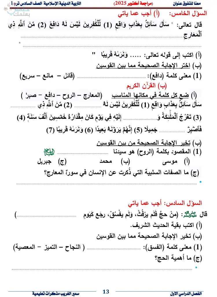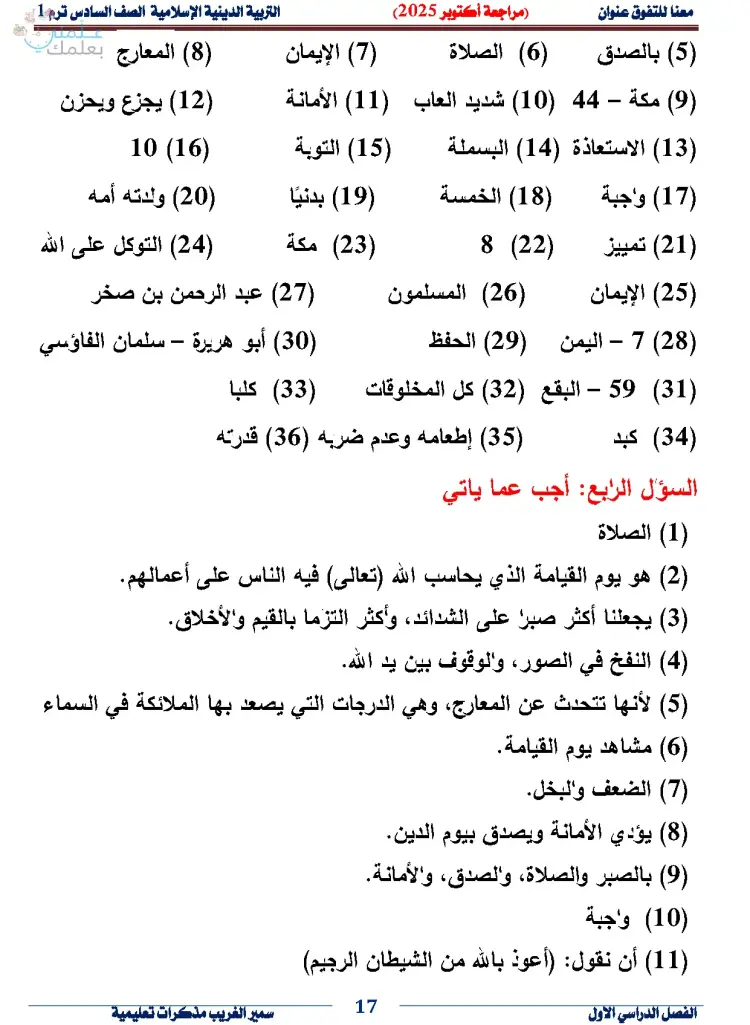 مراجعة دين شهر أكتوبر الصف السادس الابتدائي 2025 2026