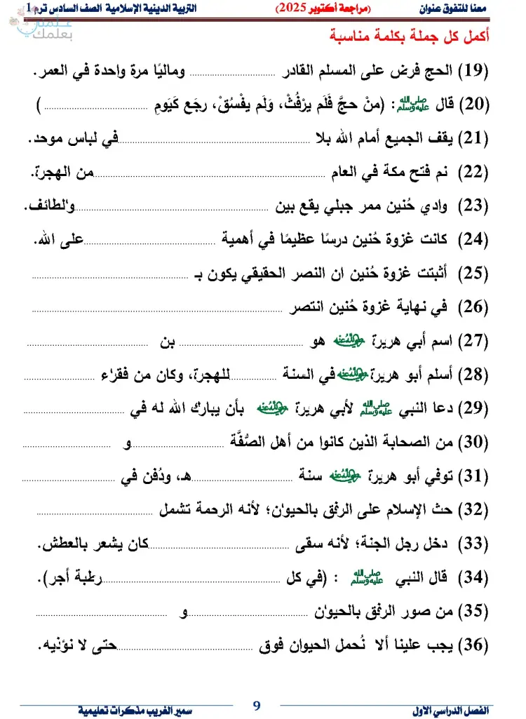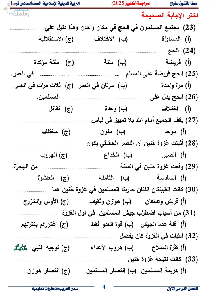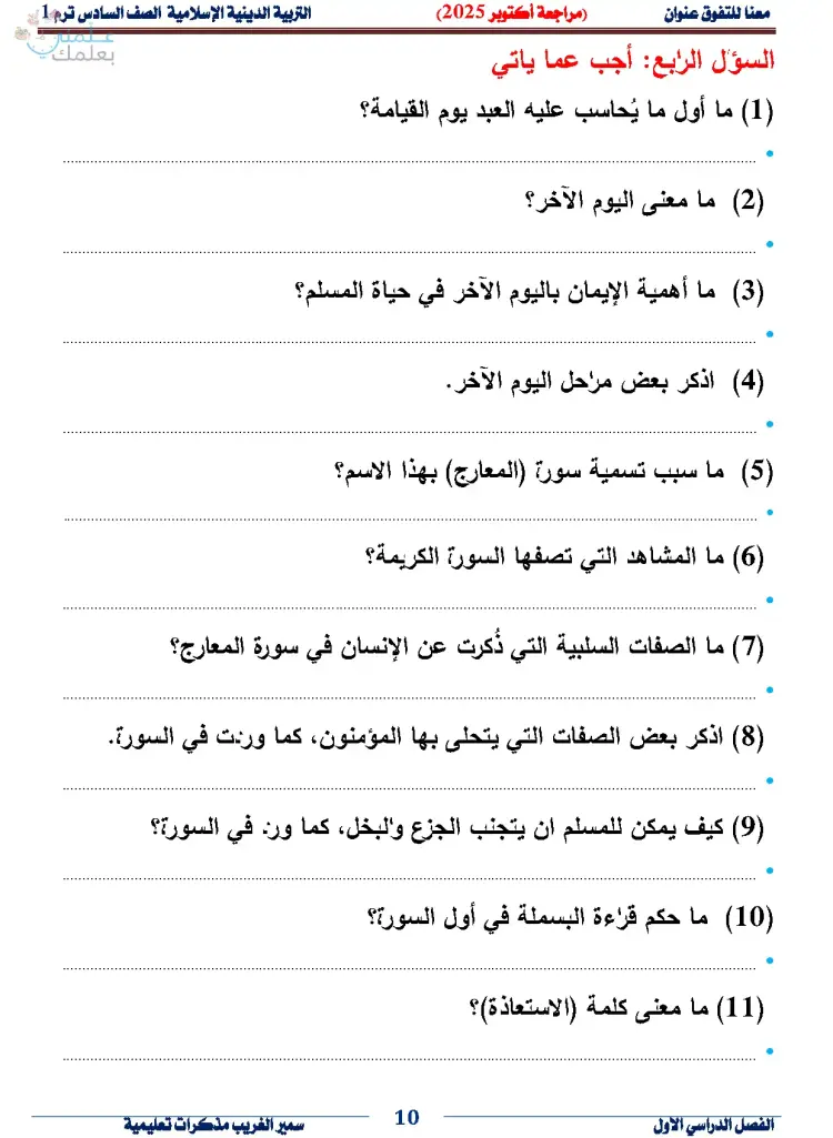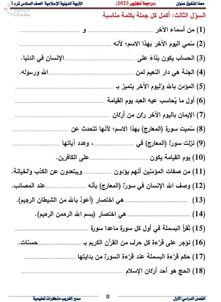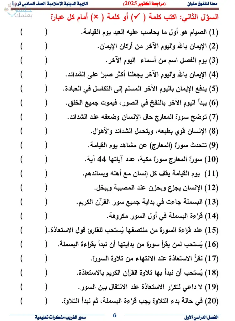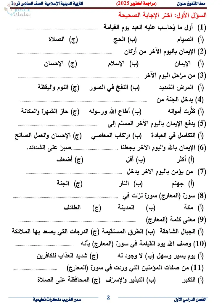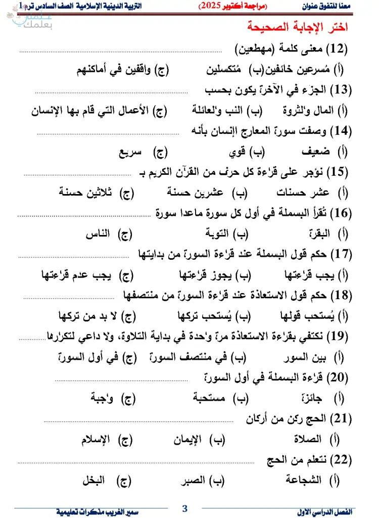 مراجعة دين شهر أكتوبر الصف السادس الابتدائي 2025 2026