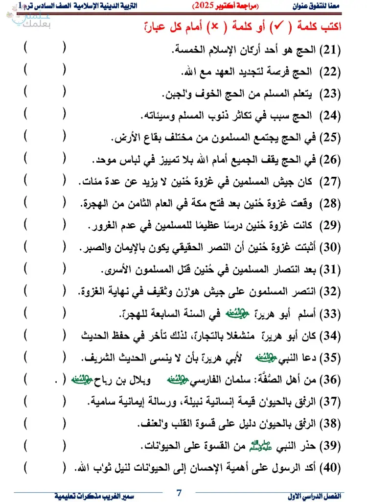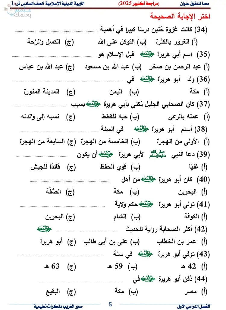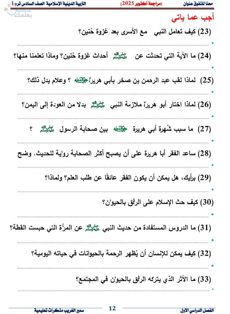 جاءت أسئلة مراجعة التربية الدينية شهر أكتوبر الصف السادس الابتدائي 2025 على النحو التالي: