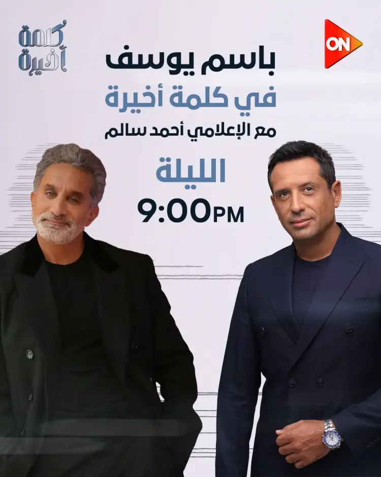 تساءل العديد من الجماهير عن موعد برنامج باسم يوسف الجديد، لمعرفة توقيت أولى حلقات سلسلة اللقاءات حصرية يقدمها الإعلامي أحمد سالم ضمن برنامج «كلمة أخيرة» على قناة ON.