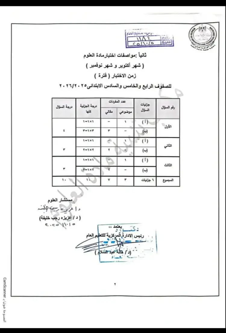 مواصفات اختبار شهر أكتوبر ونوفمبر للصف الرابع الابتدائي علوم 2025
