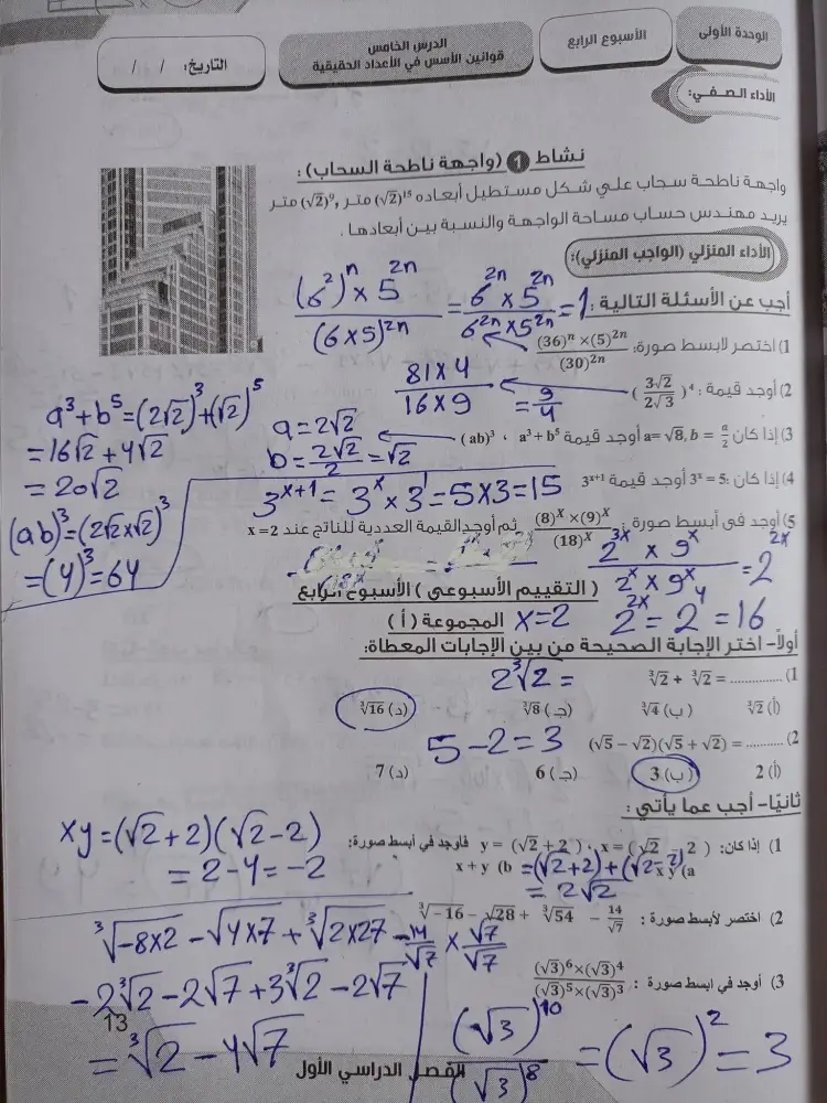 حل الأداء الصفي رياضيات ثانية إعدادي الأسبوع الرابع ترم أول 2026