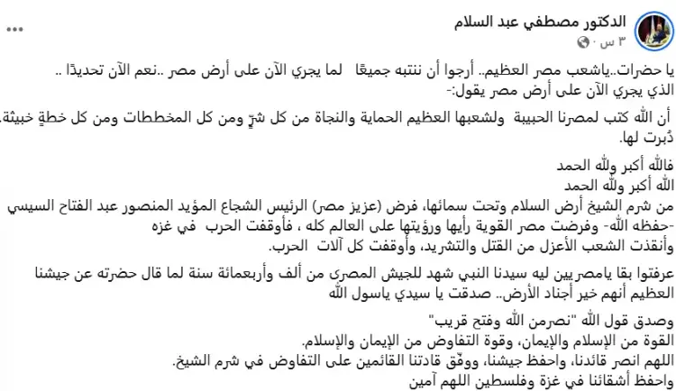 وجاء في منشور على حسابه الشخصي بموقع فيسبوك، اليوم الخميس، أن ما وصفه بـ«عزيز مصر» الرئيس عبد الفتاح السيسي قد فرض مع مصر «رأيها ورؤيتها على العالم كله» من مدينة شرم الشيخ، التي وصفها بأنها «أرض السلام».