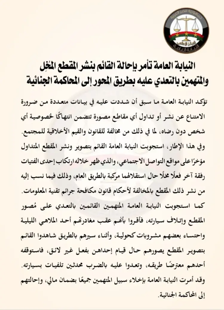 ووفقًا لبيان النيابة، فإن النشر يخالف أحكام قانون مكافحة جرائم تقنية المعلومات، الذي يجرم نشر ما من شأنه انتهاك خصوصية الغير.