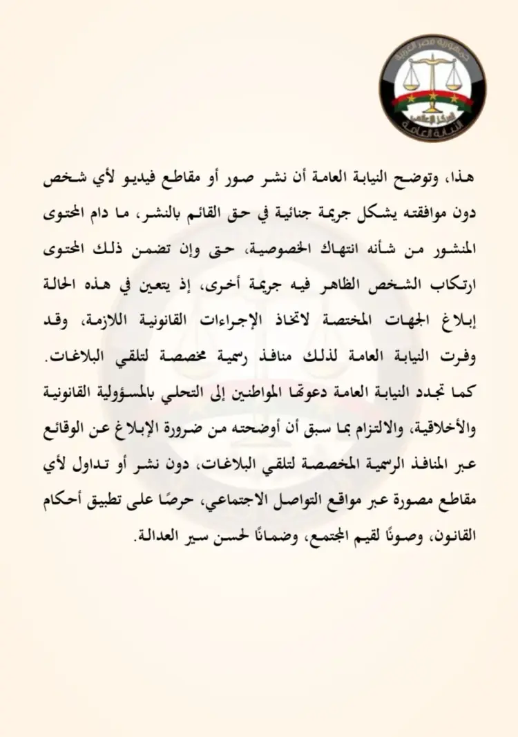 جددت النيابة العامة في بيانها الرسمي تأكيدها على مبدأ قانوني وأخلاقي مهم، مشددة على أن نشر صور أو مقاطع فيديو لأي شخص دون موافقته يشكل جريمة جنائية في حق القائم بالنشر.