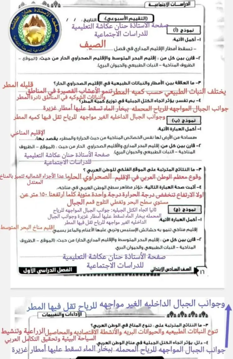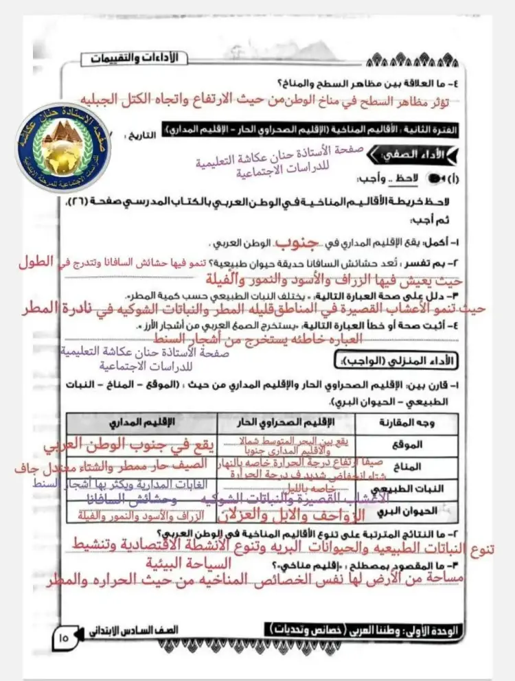 ينشر شبابيك حل الأداء الصفي والواجب وتقييم الأسبوع الرابع دراسات للصف السادس الابتدائي ترم أول 2026.