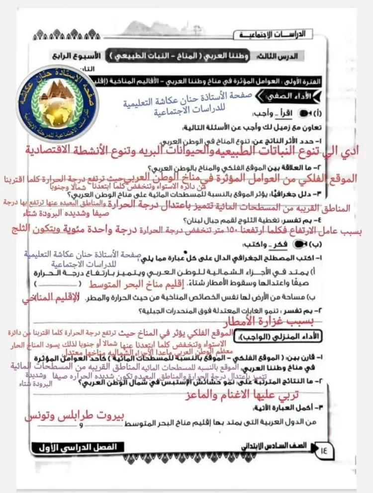 حل الأداء الصفي والواجب وتقييم الأسبوع الرابع دراسات للصف السادس الابتدائي ترم أول 2026