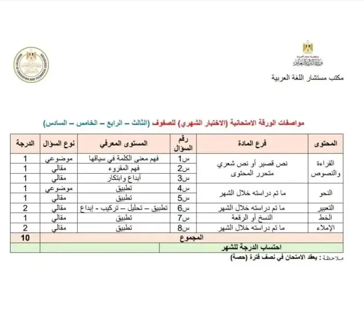 أعلن مكتب مستشار اللغة العربية التابع لوزارة التربية والتعليم والتعليم الفني مواصفات اختبار شهر أكتوبر عربي للصف الثالث الابتدائي 2026، وجميع مواصفات الورقة الامتحانية للشهور، في الفصل الدراسي الأول.