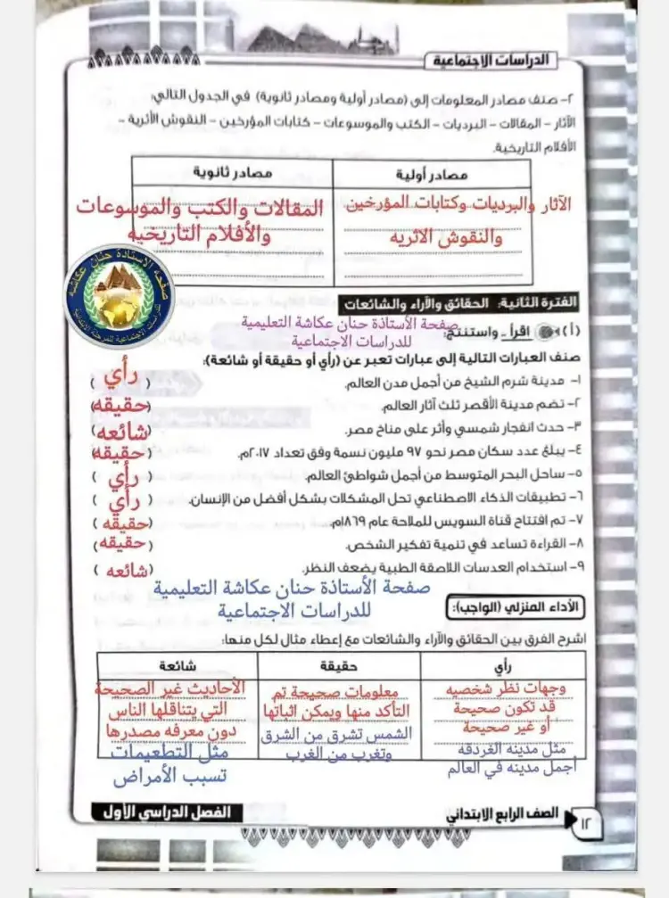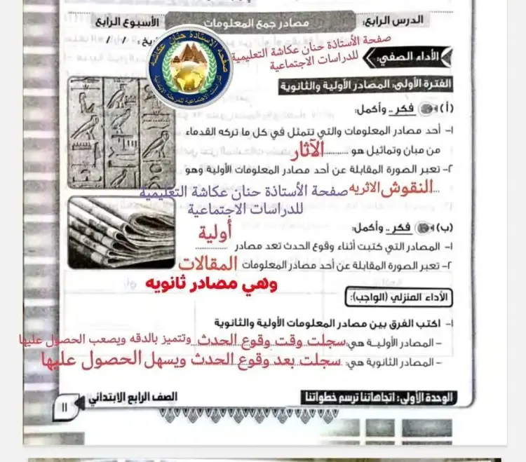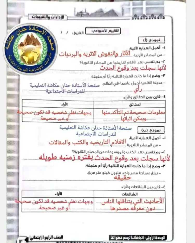 لمتابعة حل الأداء الصفي وواجب وتقييم الأسبوع الرابع دراسات للصف الرابع الابتدائي ترم أول 2026 يمكنك الإطلاع على الصور التالية: