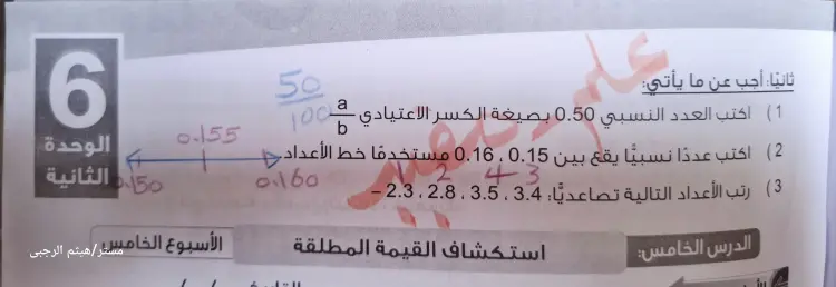 اكتب العدد النسبي 0.50 بصيغة الكسر الاعتيادي (أ/ب).