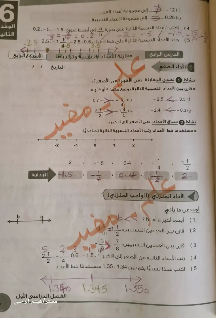 حل الأداء الصفي رياضيات سادسة ابتدائي الأسبوع الرابع ترم أول 2026