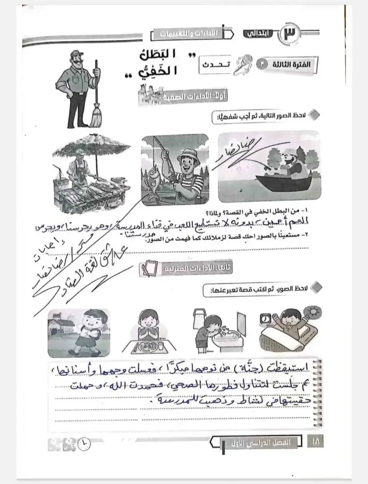 الإجابة: البطل هو العم أمين، لأنه يحرس المدرسة والطلاب ولا يستطيع اللعب معهم.