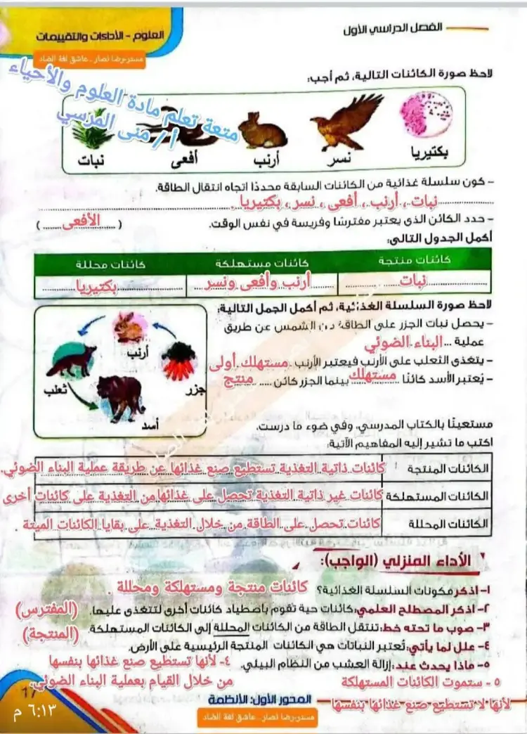 أذكر مثالاً واحدًا لكلًا من: أ- حيوانات تتغذى على الأعشاب. ب- حيوانات تتغذى على حيوانات أخرى. أ- أرنب. ب- نسر/ثعلب.