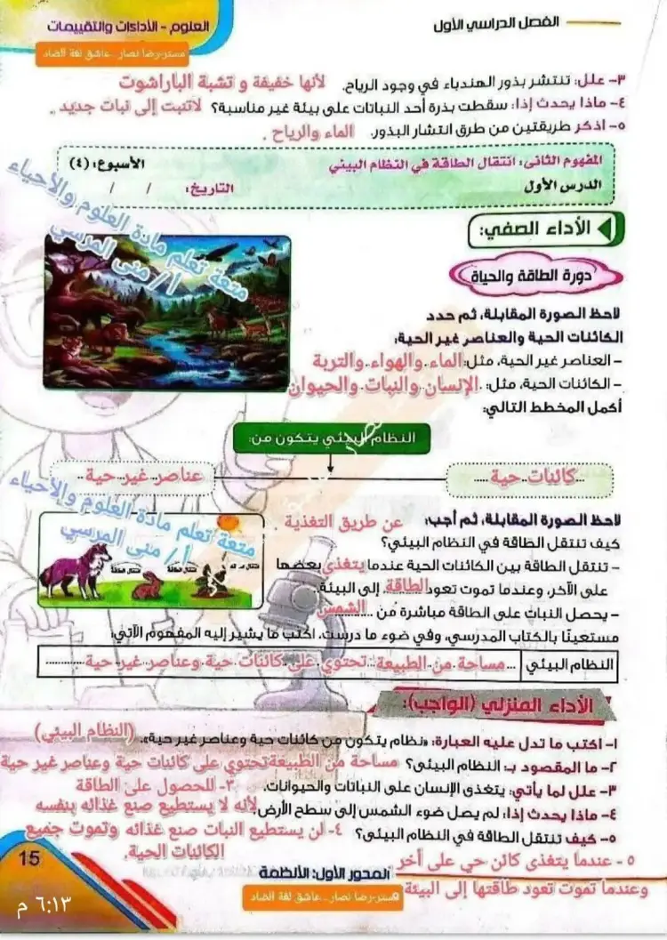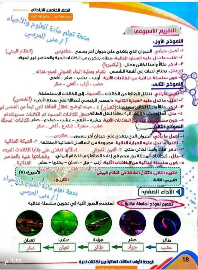 حل الأداء الصفي والواجب المنزلي والتقييم الأسبوعي الرابع علوم للصف الخامس الابتدائي 2026