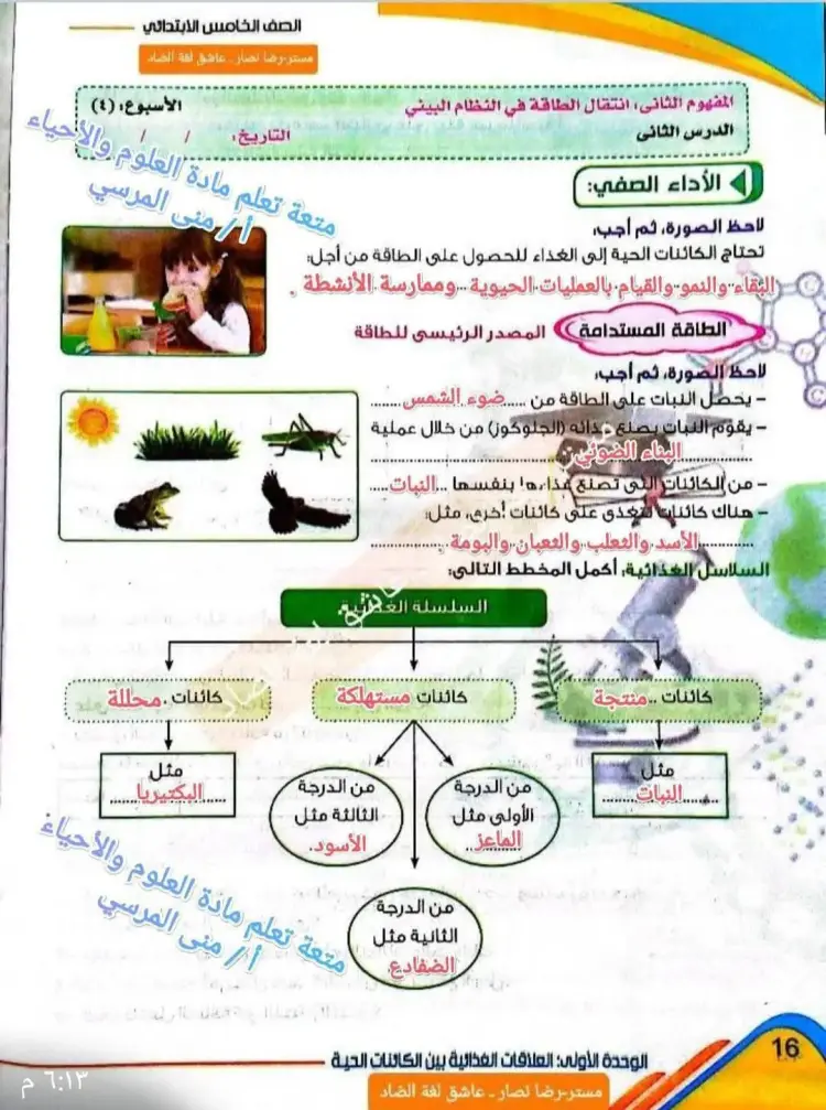 أكمل ما يأتي: تنتقل الطاقة من الكائنات... إلى الكائنات المستهلكة. المنتجة