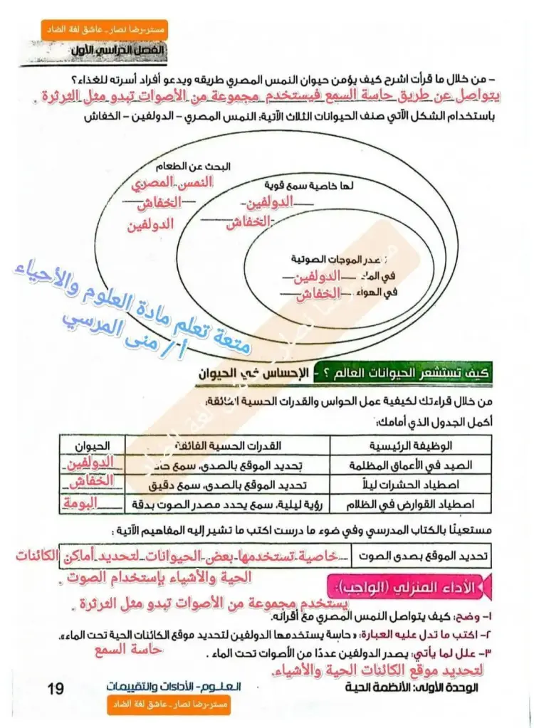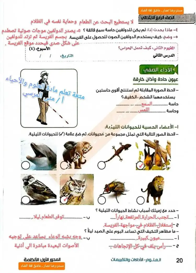 1- أكمل: من الحيوانات التي لديها القدرة على تحديد موقع فريستها بالصدى البومة و الخفاش.