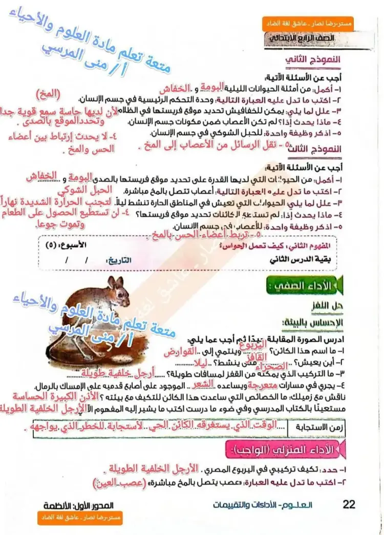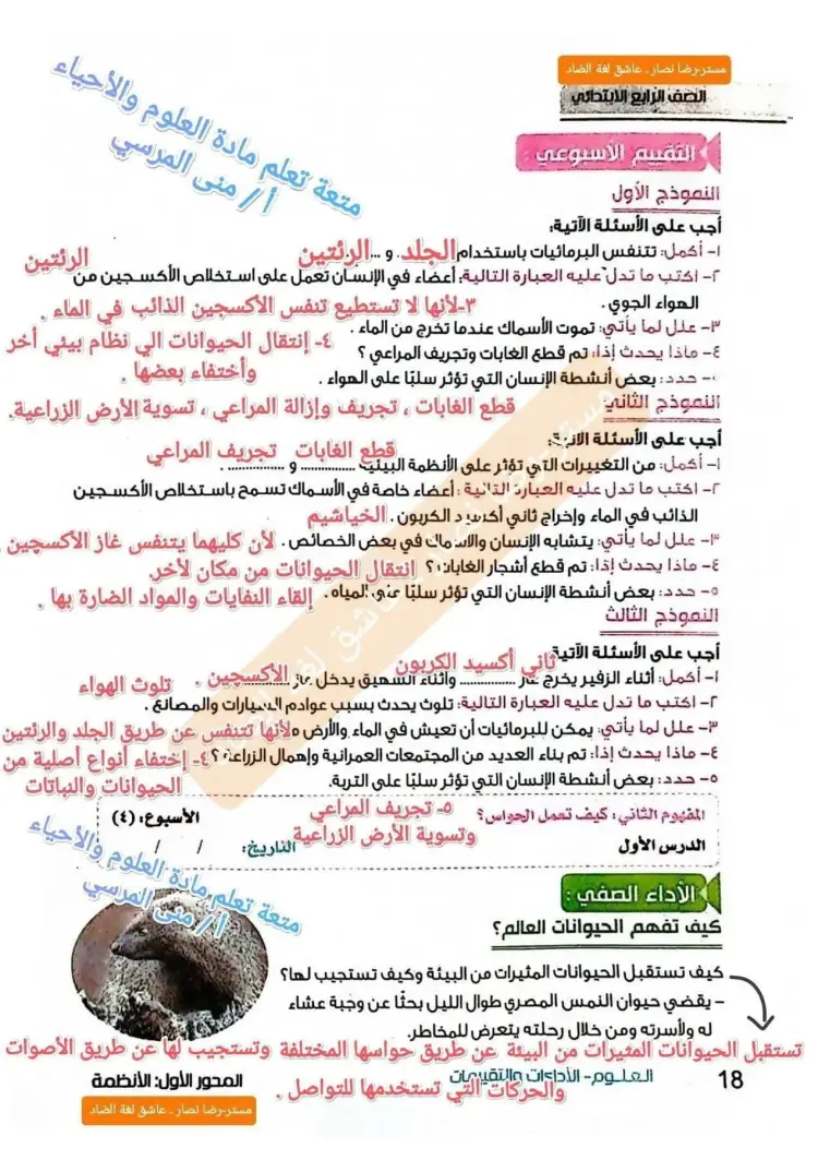 إجابات أداءات وتقييمات علوم رابعة ابتدائي أسبوع رابع