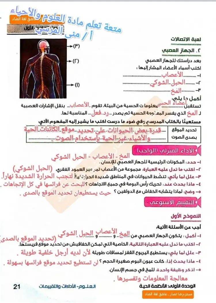 1- أكمل: يتكون الجهاز العصبي من المخ و الأعصاب و الحبل الشوكي.
