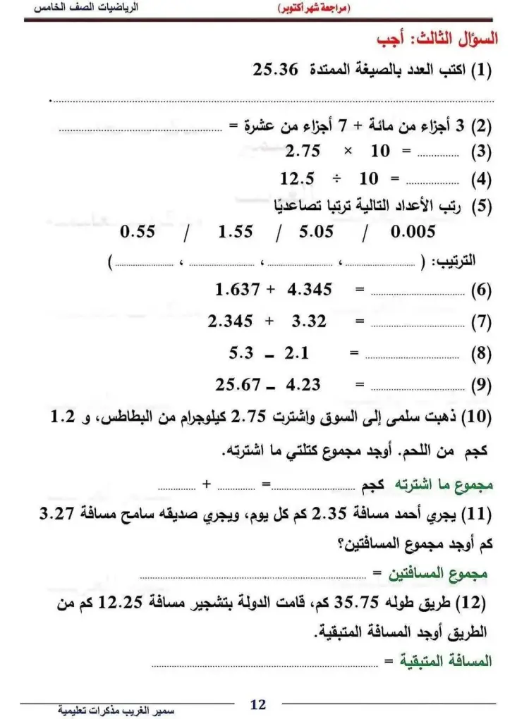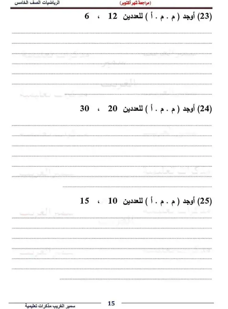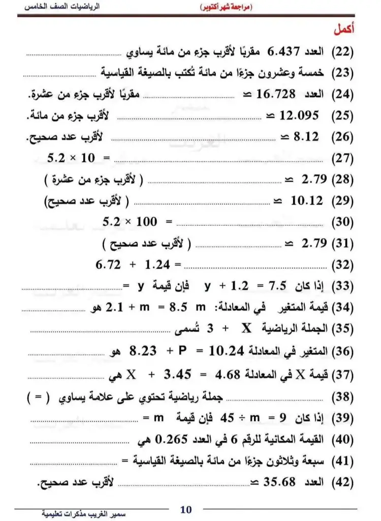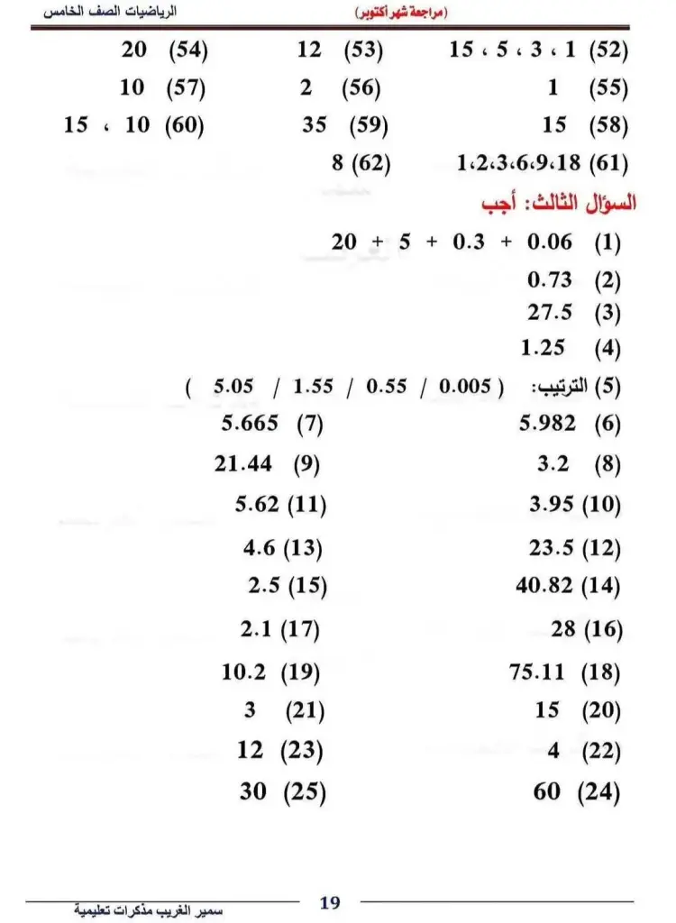 مراجعة شهر أكتوبر رياضيات الصف الخامس الابتدائي 2025 2026