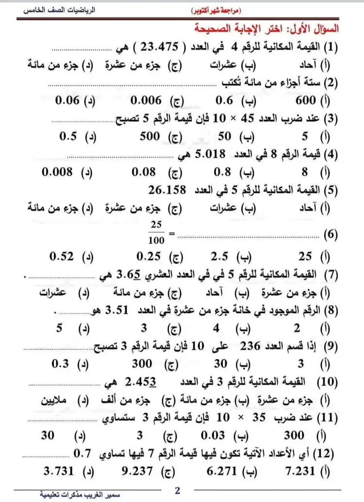 جاءت أسئلة مراجعة شهر أكتوبر رياضيات الصف الخامس الابتدائي 2025 2026 على النحو التالي: