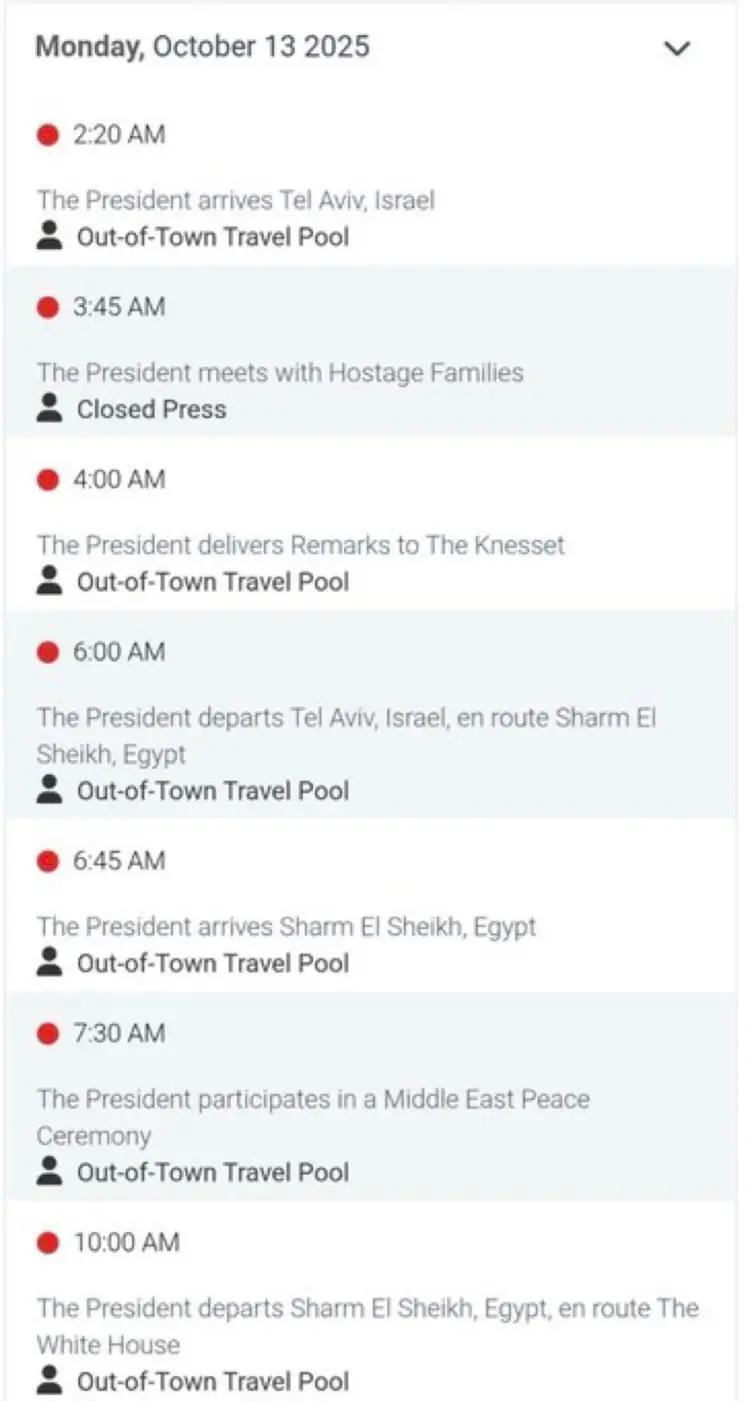 ومن المقرر، أن يلتقي ترامب بعائلات المحتجزين في كنيست الاحتلال البرلمان، وفي الساعة 11:00 صباحاً، سيلقي خطابه في الكنيست، والذي سيستغرق حوالي ساعة.