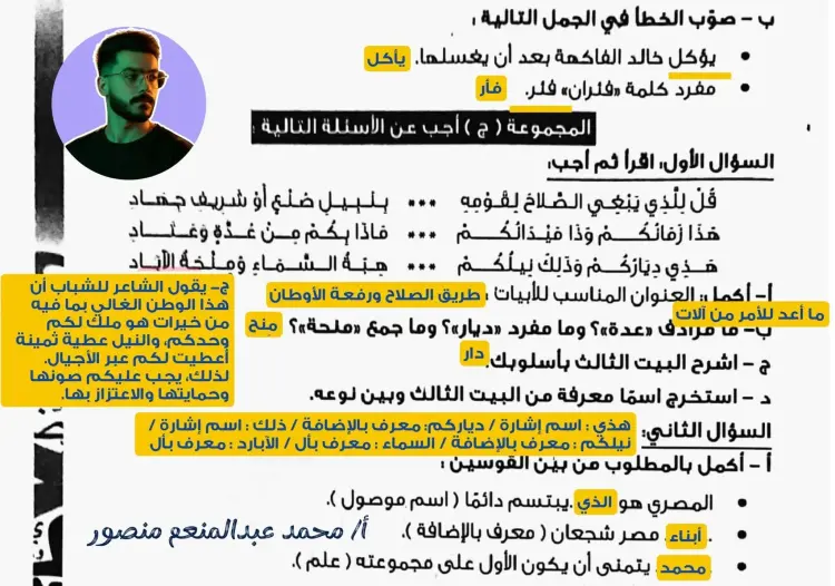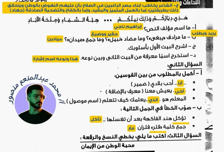 يشمل حل الواجب المنزلي عربي سادسة ابتدائي الأسبوع الرابع ترم أول 2026 على عدد من الأسئلة والإجابات والتي منها ما يلي: