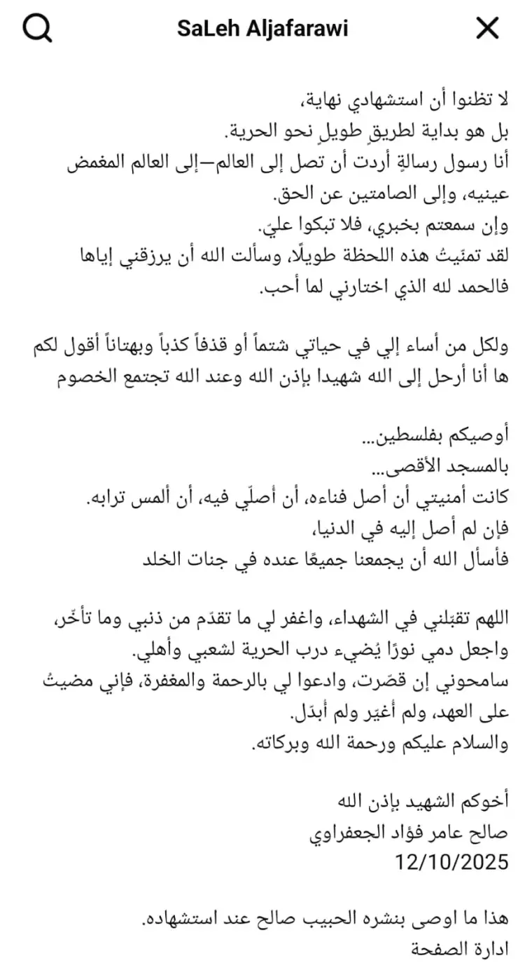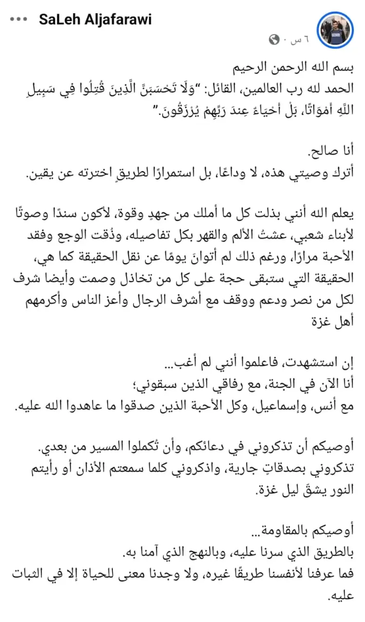 نُشرت وصية الصحفي صالح الجعفراوي بعد ساعات من إعلان استشهاده يوم الأحد الموافق 12 أكتوبر 2025، إثر تعرضه لإطلاق نار في حي الصبرة جنوبي مدينة غزة.
