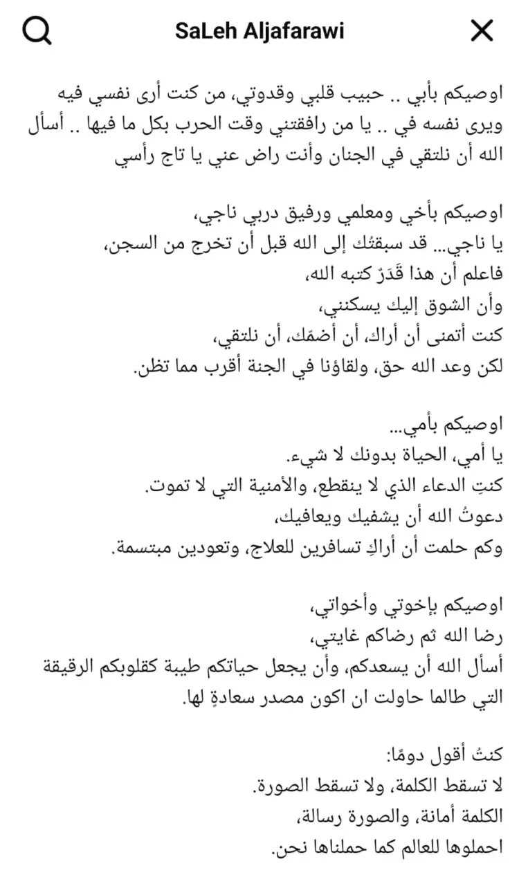 ولم تقتصر وصية الصحفي صالح الجعفراوي على الجانب العائلي، بل حملت في طياتها دعوة صريحة لمواصلة الطريق الذي سار عليه، مؤكدًا على أهمية المقاومة كنهج وحيد.