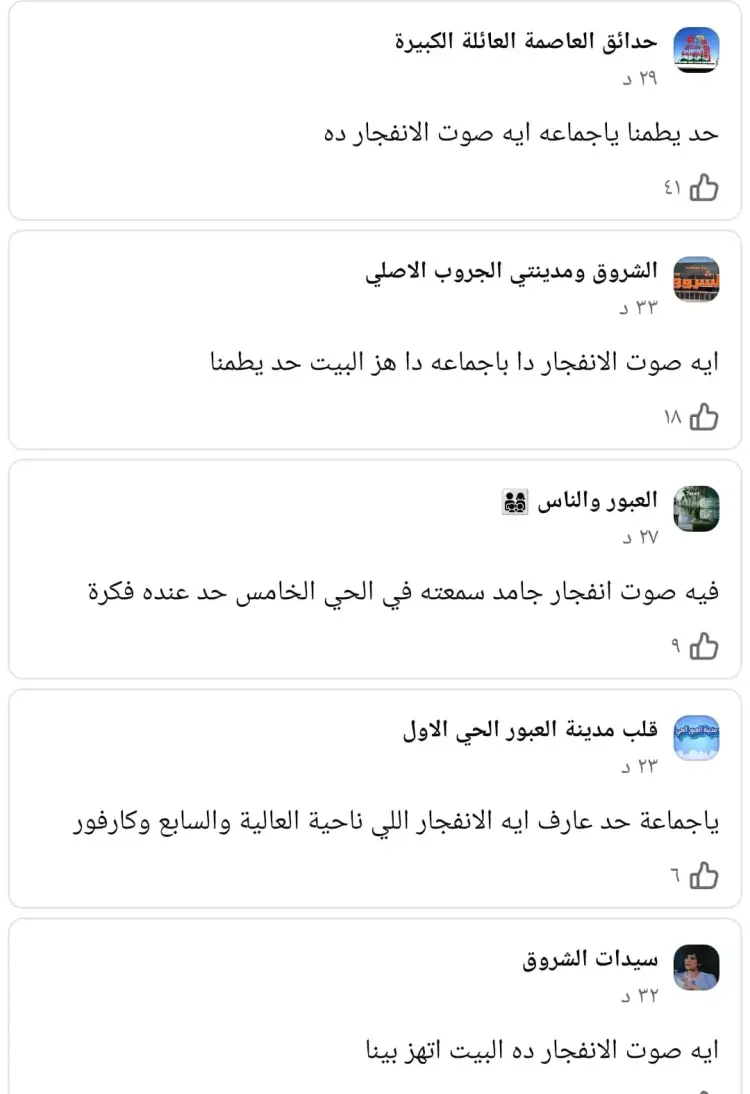 وامتدت حالة القلق لتشمل مناطق متعددة، حيث كتب أحد سكان مدينة العبور: «فيه صوت انفجار جامد سمعته في الحي الخامس حد عنده فكرة»، بينما أشار آخر إلى أن الصوت سُمع بوضوح «ناحية السابع وكارفور».