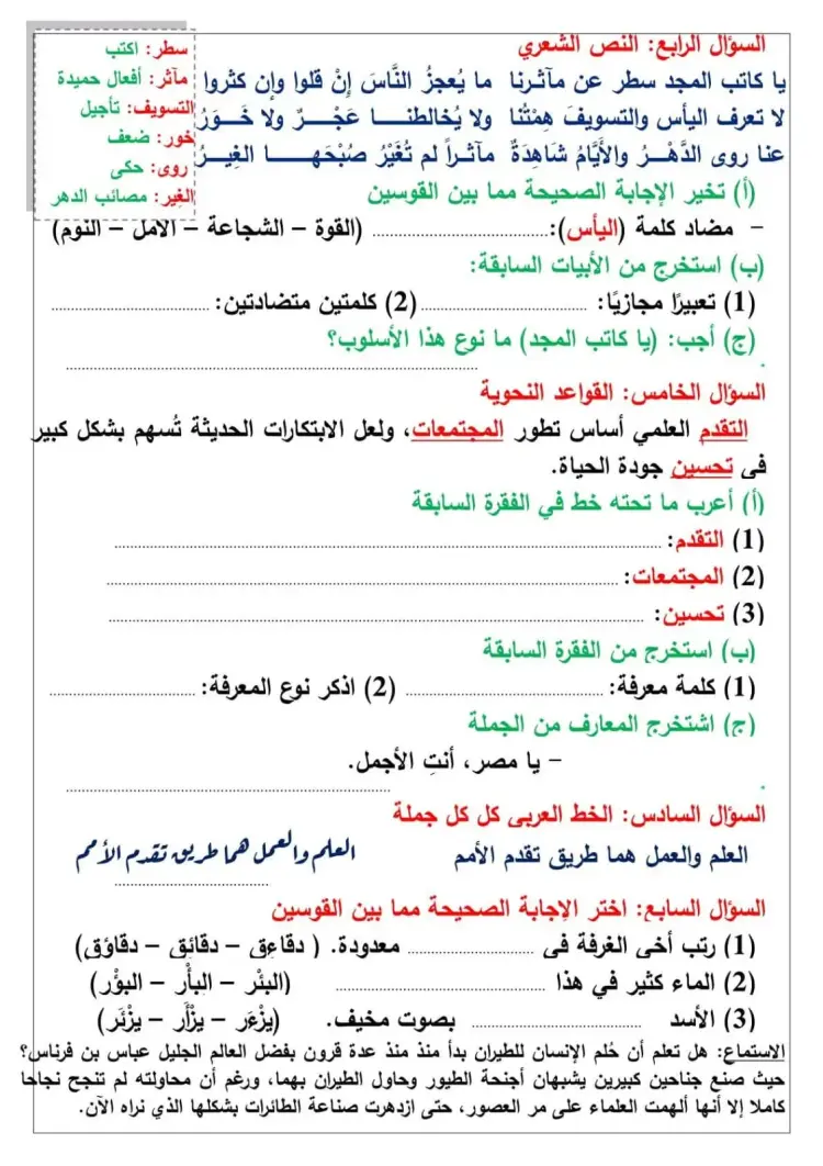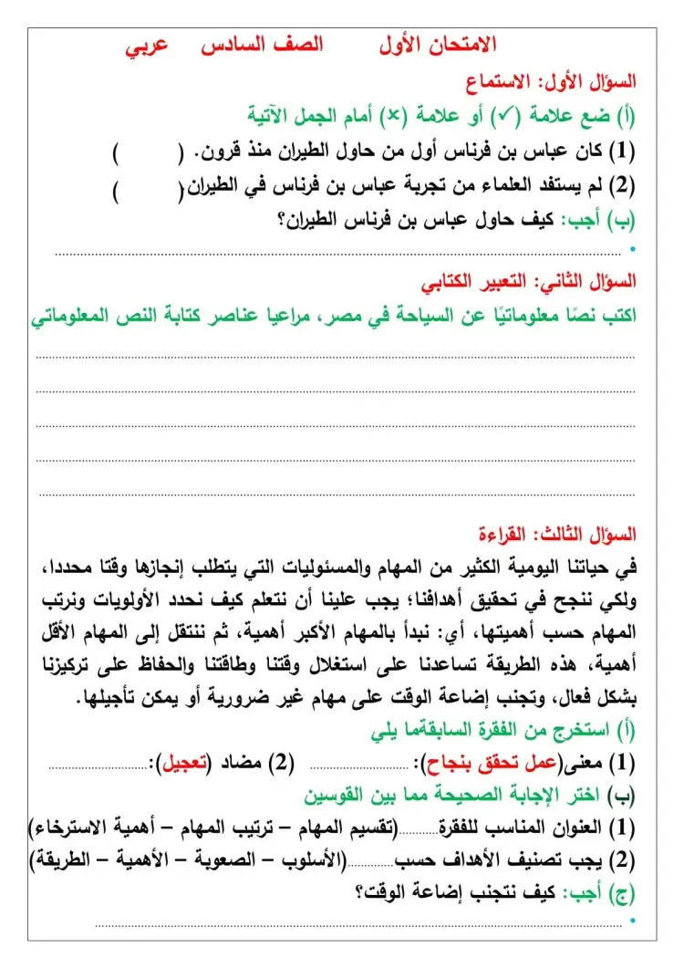 امتحان على الوحدة الأولى عربي سادسة ابتدائي ترم أول 2025 2026