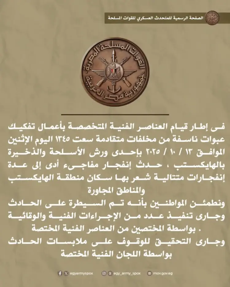 اتخذت القوات المسلحة، بالتعاون مع الجهات المعنية، إجراءات عاجلة للسيطرة على انفجار القاهرة واحتواء آثاره في أسرع وقت.